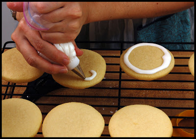 using your left hand, guide the piping tip over the cookie as you gently squeeze out icing.